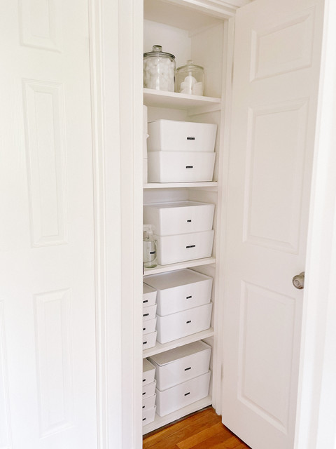 My number one goal in planning this space was to avoid clutter. I really hate opening a closet and having things topple over onto my head! It also stresses me out to have things shoved into places where they don't belong. I wanted everything to have a spot, be clearly labeled and easy to find, and accessible. I would have loved to also include spare bedding/towels in here, but the shelves are fairly shallow. Luckily we have enough space in the guest room closet for these items.